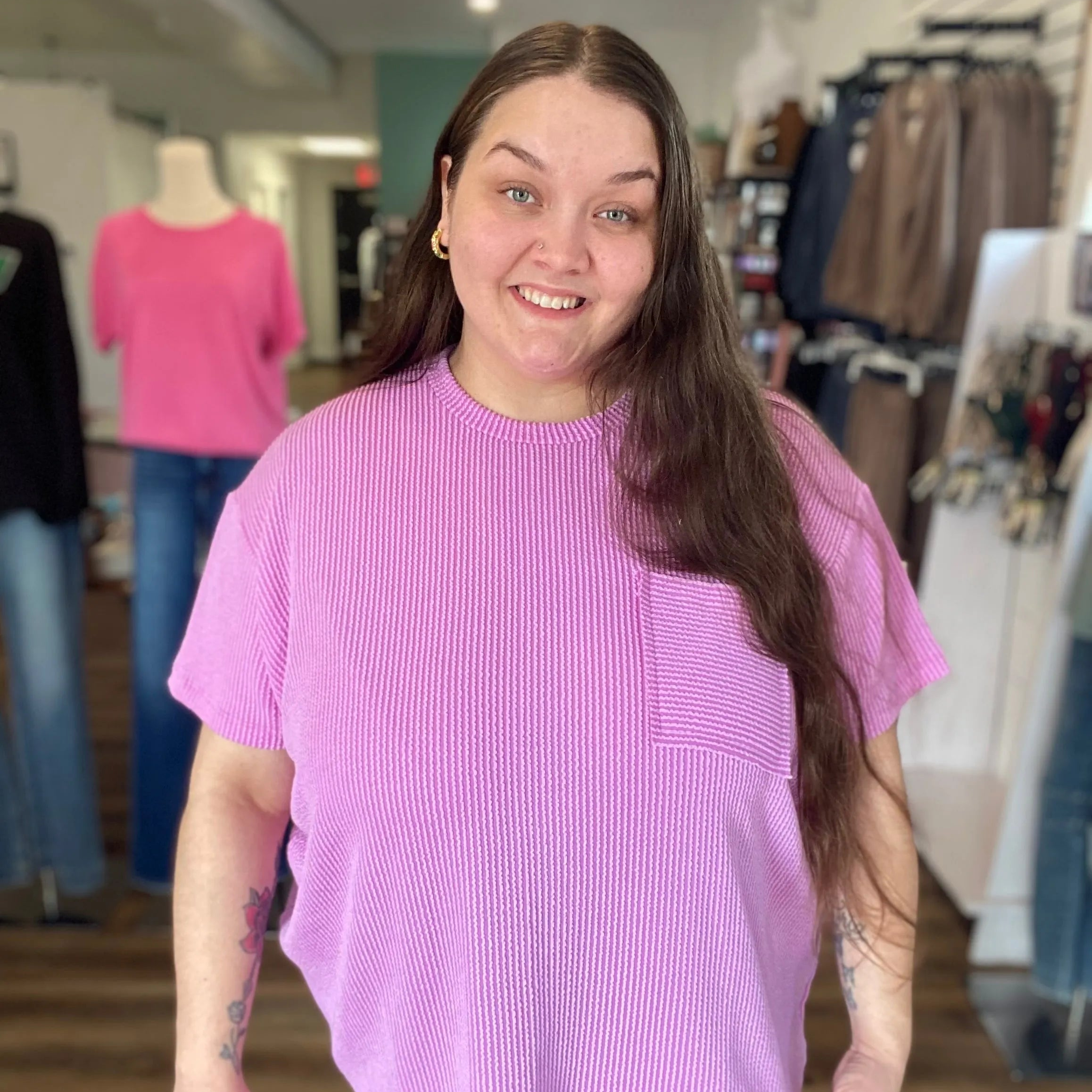 Wavy Ribbed Short Sleeve Pocket Top - Violet