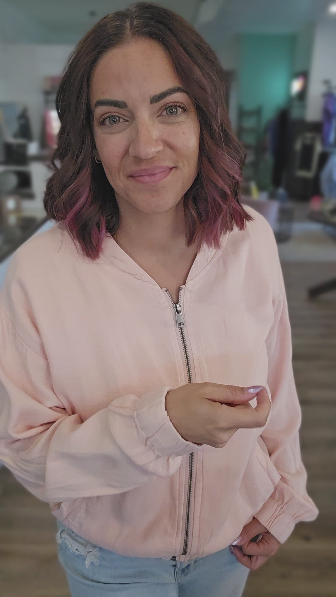 - Classic zip up baseball jacket made with our soft textured Tencel™ Lyocell fabric in blush