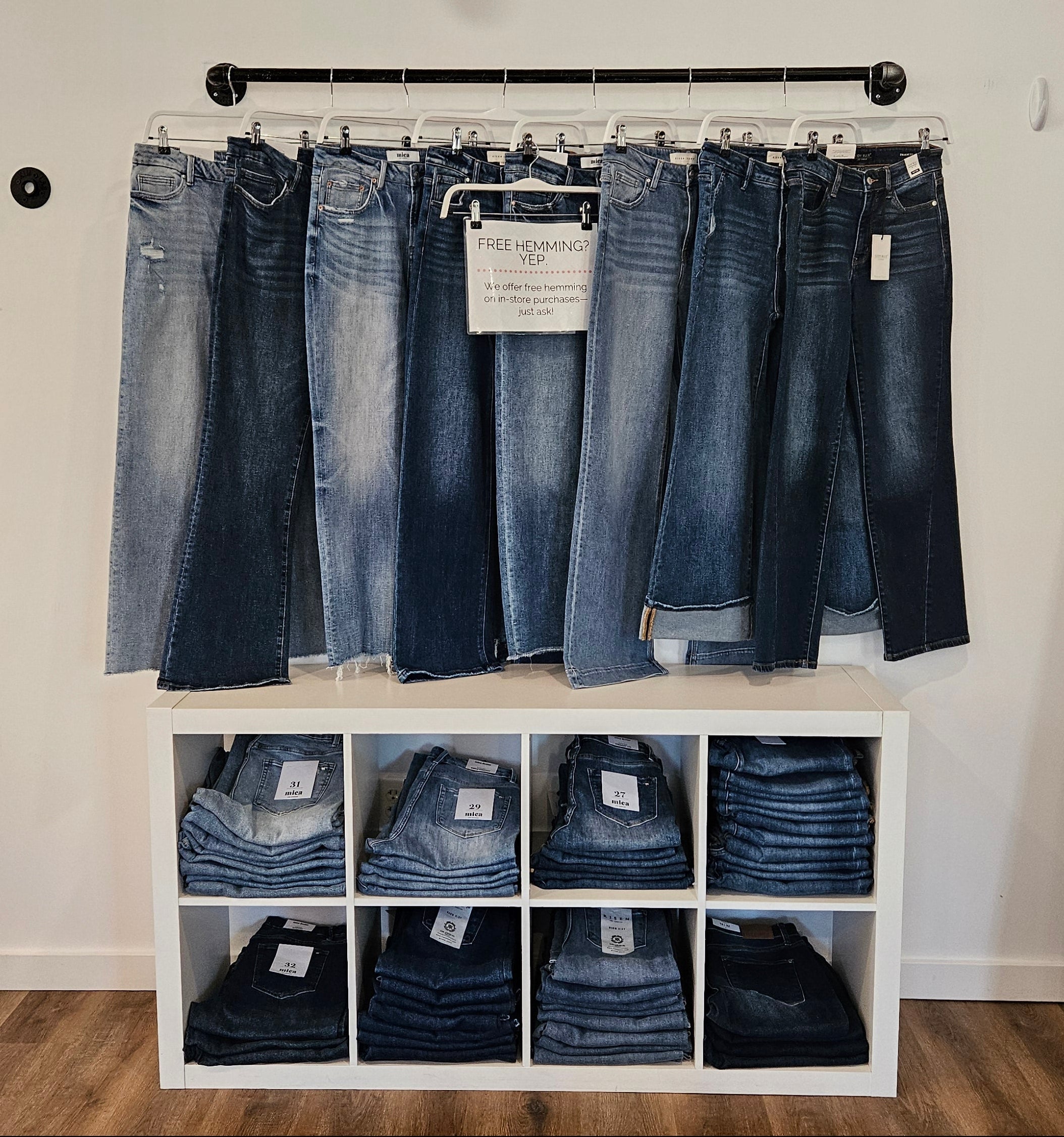 With a selection of top boutique brands like Judy Blue, Risen, Vervet/Lovervet as well as other personal favorites like Mica, we carry a variety of styles to meet all your denim needs. Long gone are the days of stiff, uncomfortable jeans. All of our denim has great stretch and recovery so you can wear them out without them getting baggy through the day. Whether you're looking for bootcut, straight leg or skinny, colored or classic blue, distressed or a cleaner, more professional look, you'll find your new favorite pair of jeans at Ruby Joy!
