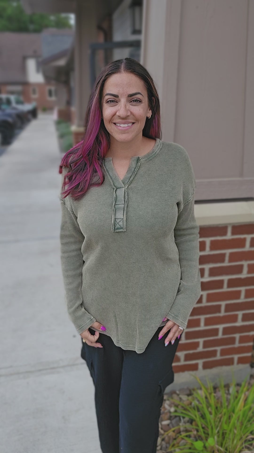 This is your cool-weather go-to with a little edge. The mineral-washed green chive color gives it a lived-in look, and the textured thermal knit is soft without being bulky. The relaxed fit, drop shoulder, and split henley neckline make it feel easy, effortless, and just right for layering or wearing solo with jeans or joggers.