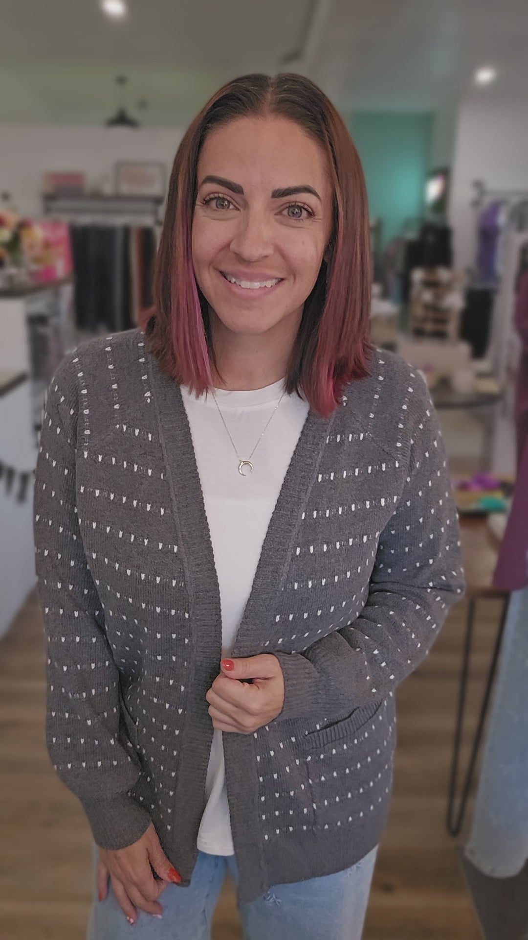 A classic layer with a playful touch. This open-front cardigan features a soft charcoal knit patterned with tiny white dotted stripes for an easy, modern look. With raglan sleeves, patch pockets, and a longer length, it’s one of those throw-on-and-go pieces you’ll keep reaching for.