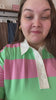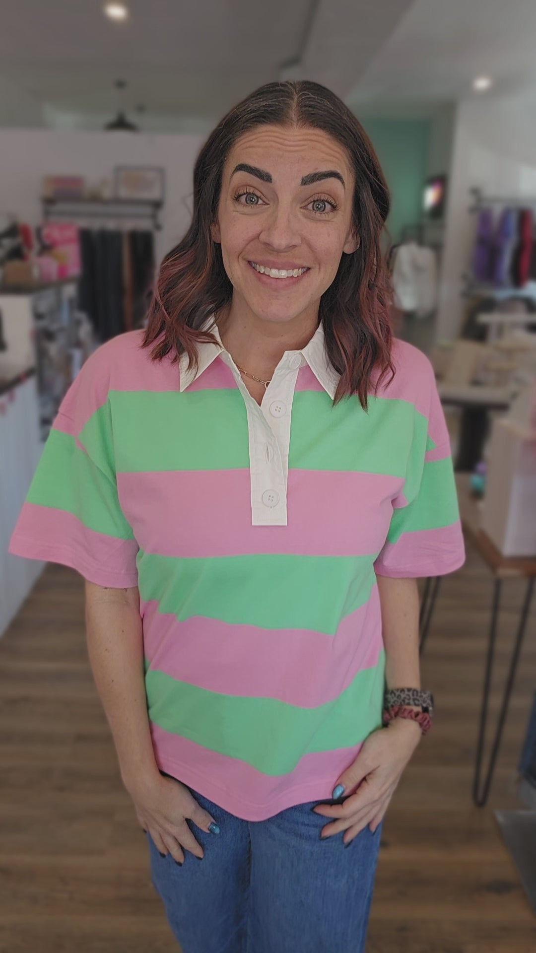 This standout top features bold pink and green stripes paired with a crisp white collared split neck for a modern take on a classic preppy look. With half sleeves and a relaxed, stretchy fit, it offers the perfect blend of style and comfort. Whether you're heading to a coffee date or a casual outing, this polo is your new go-to for effortless, "cool-girl" vibes.