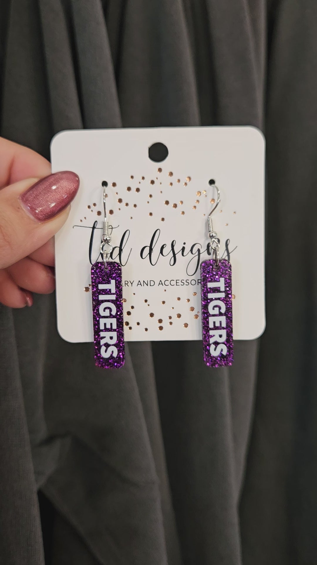 These earrings are the perfect way to show off your school spirit. With a dangling purple glitter post that says "Tigers" in white, they're like a little party for your ears.