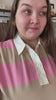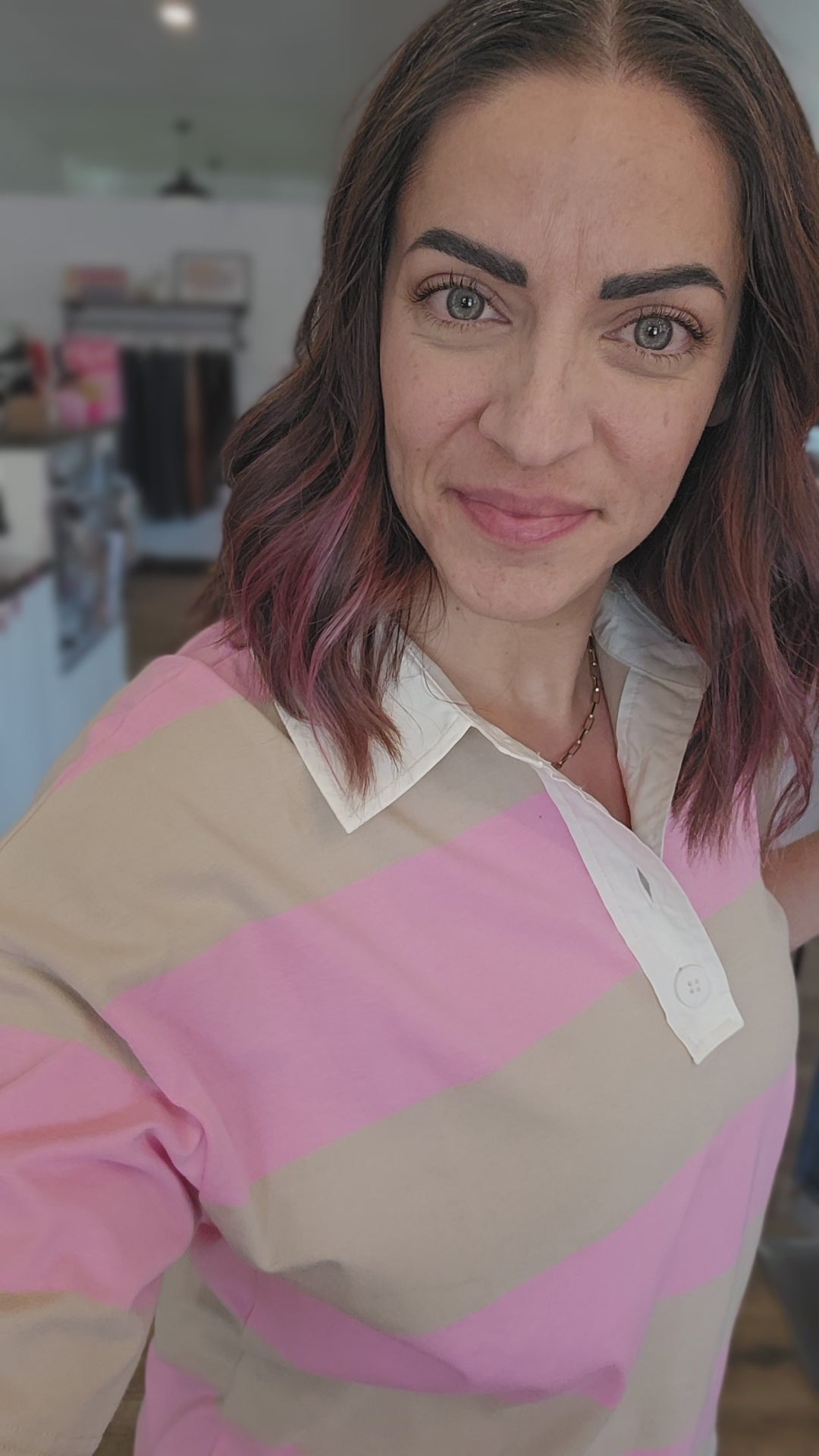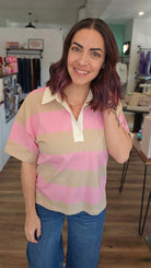 This standout top features chic pink and taupe stripes paired with a crisp white collared split neck for a modern take on a classic preppy look. With half sleeves and a relaxed, stretchy fit, it offers the perfect blend of style and comfort. Whether you're heading to a coffee date or a casual outing, this polo is your new go-to for effortless, "cool-girl" vibes.