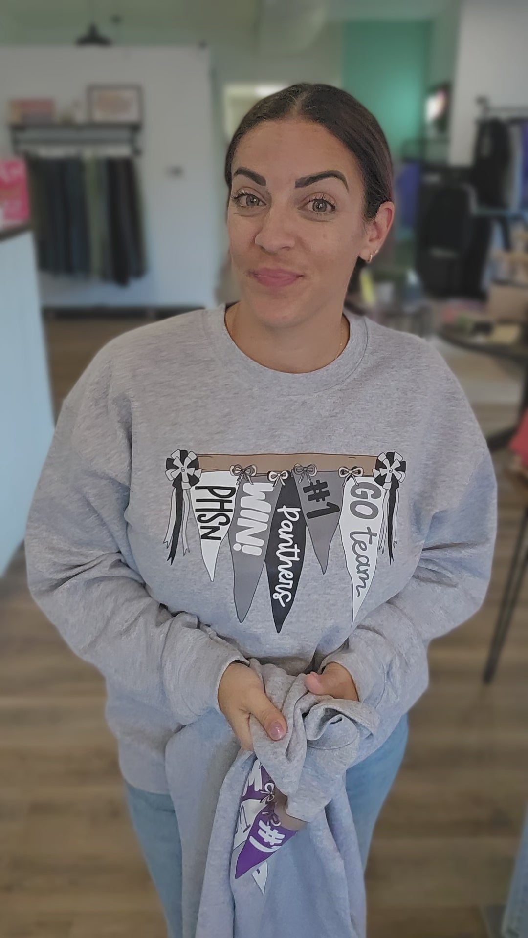 This grey Gildan sweatshirt features a retro-inspired Pickerington pennant banner graphic—choose Panthers or Tigers to show your side. Soft, unisex, and easy to wear all season long. Perfect for crisp morning classes, late-night games, or just repping your team in comfort.