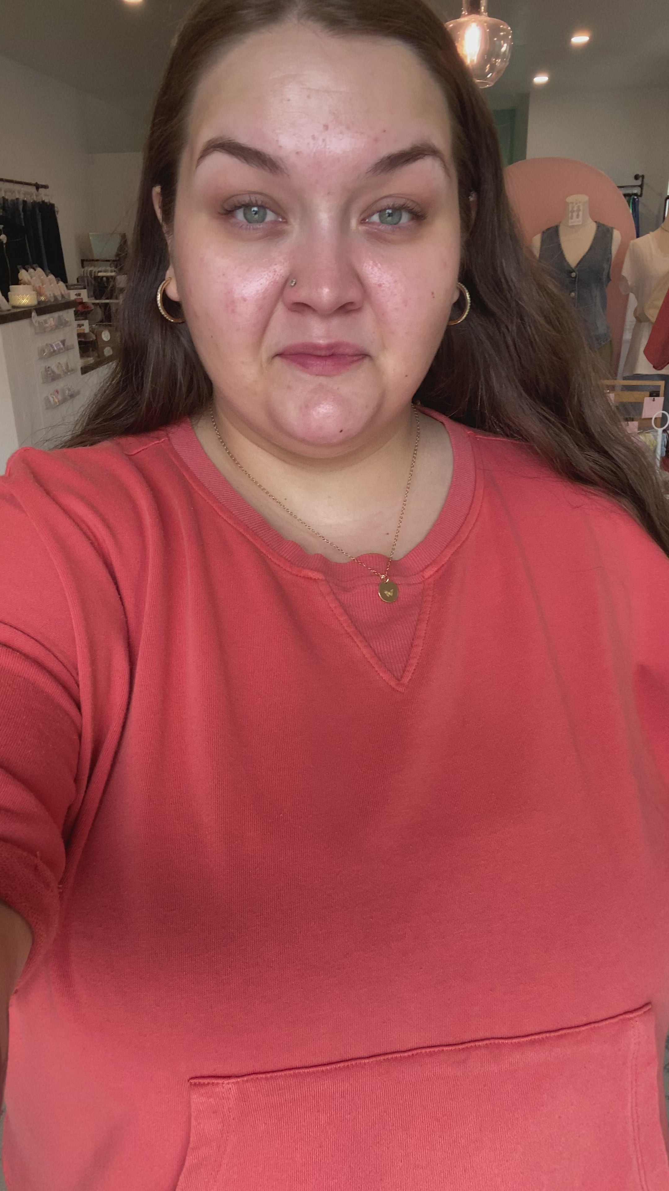 Easy, comfy, and versatile—this short sleeve sweatshirt is made for laid-back days and effortless style. The washed coral hue gives it a vintage, sun-faded vibe, while the rolled sleeves, drop shoulders, and front pocket keep it casually cool. Slightly cropped with a relaxed fit, it pairs perfectly with high-rise jeans or cutoffs. You’ll wear this one on repeat—whether you’re heading out or staying in.